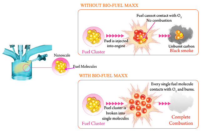 BIO-FUEL MAXX® introduces the molecular organic neutralization inducers to balance these forces of molecular interactions. It separates big fuel clusters into small single molecules that will further react immediately with oxygen in combustion and results in significant fuel savings and reduces harmful emissions.